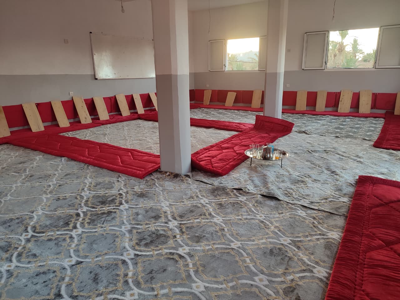 تفريش القاعة بزرابي وأفرشة مناسبة للجلوس.